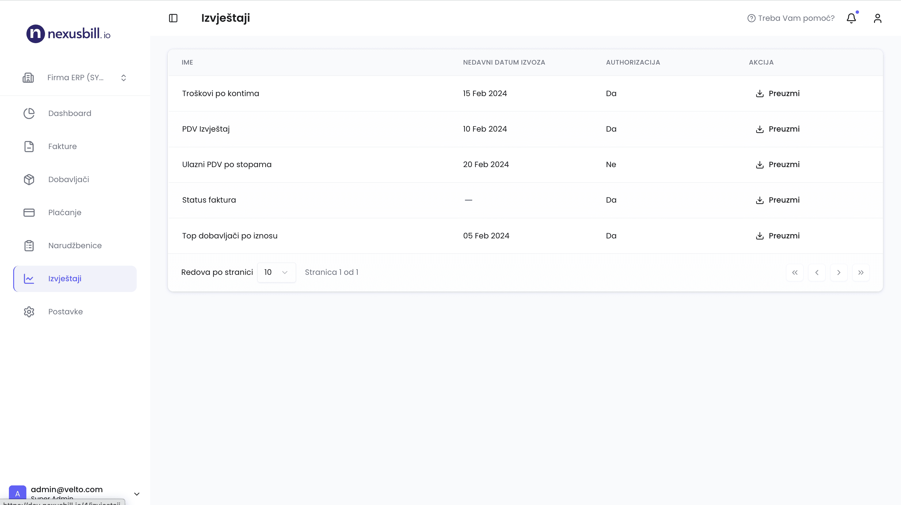 U sekciji Izvještaji, odaberite firmu za koju želite generisati izvještaj.
