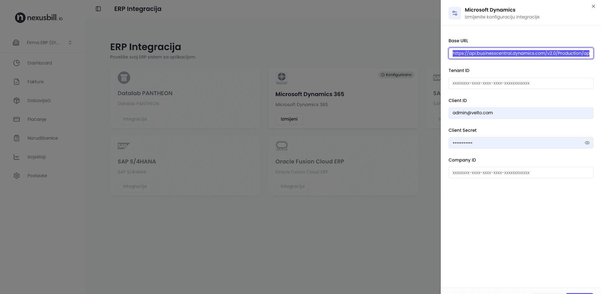 U sekciji Postavke odaberite ERP Integracija. U ovom dijelu unosite pristupne kredencijale za vaš ERP sistem. Ove kredencijale dobijate od NexusBill tima u saradnji sa vašim ERP konsultantima, jer su specifične za svaku kompaniju i ERP instalaciju.
