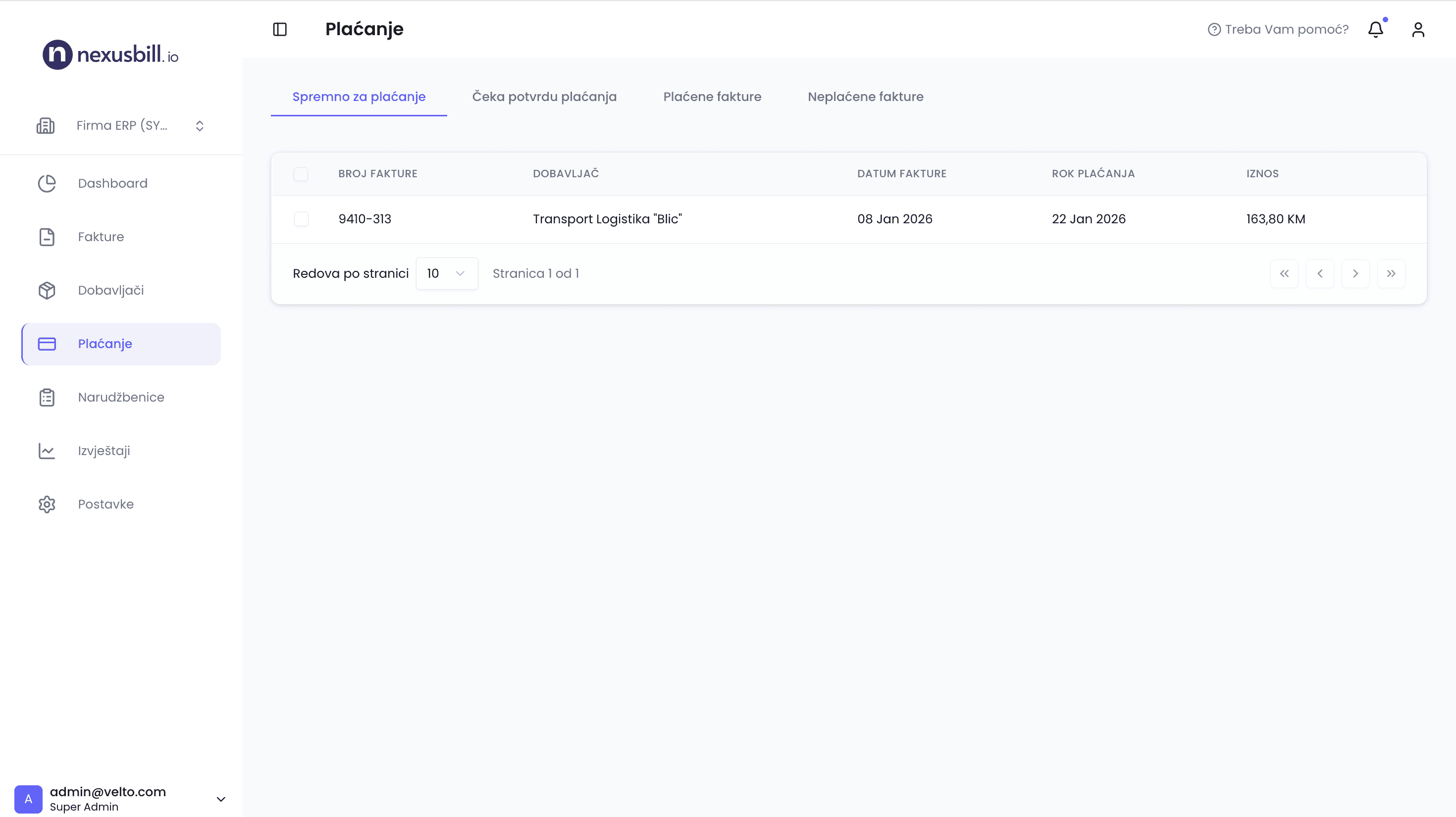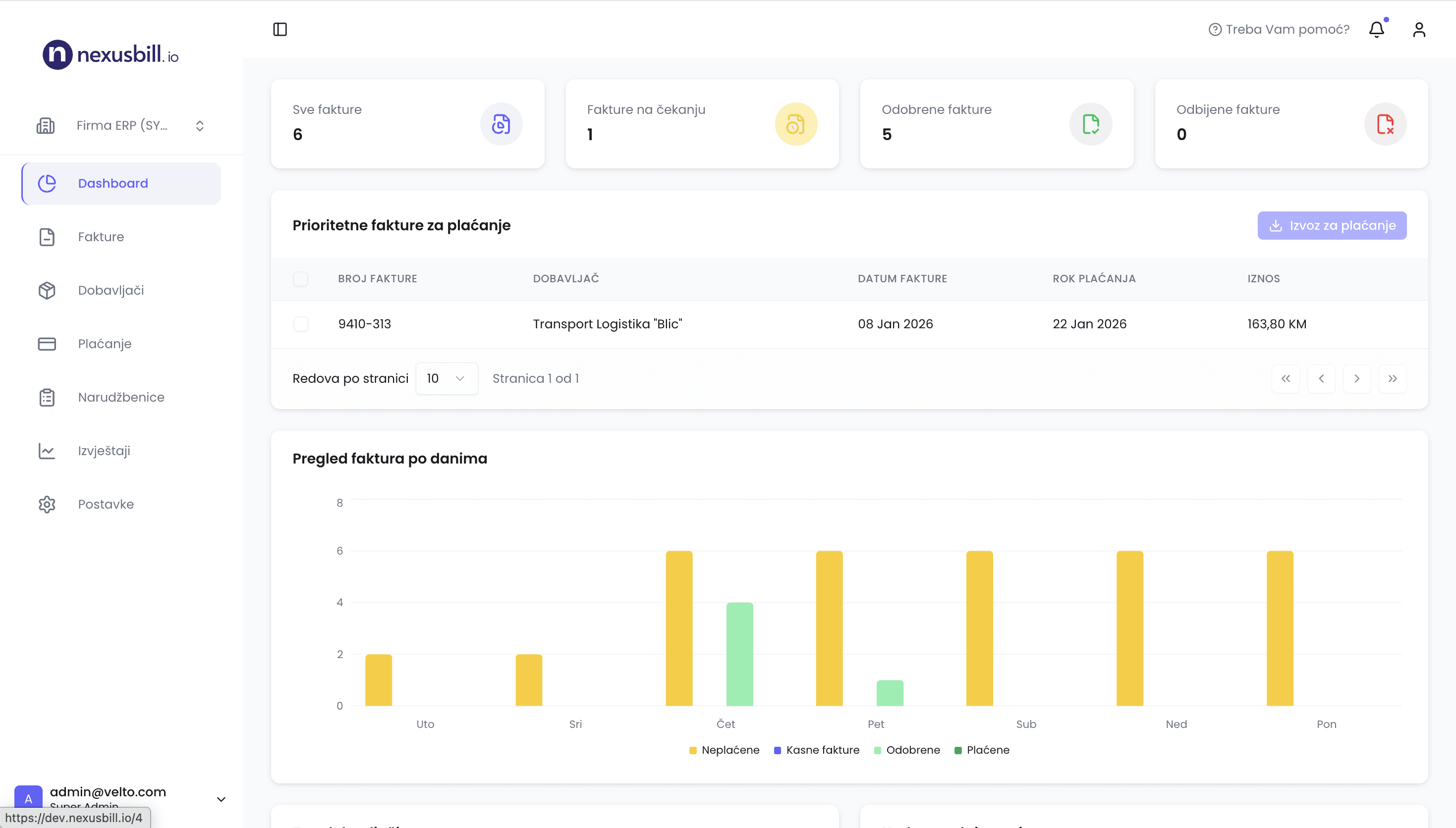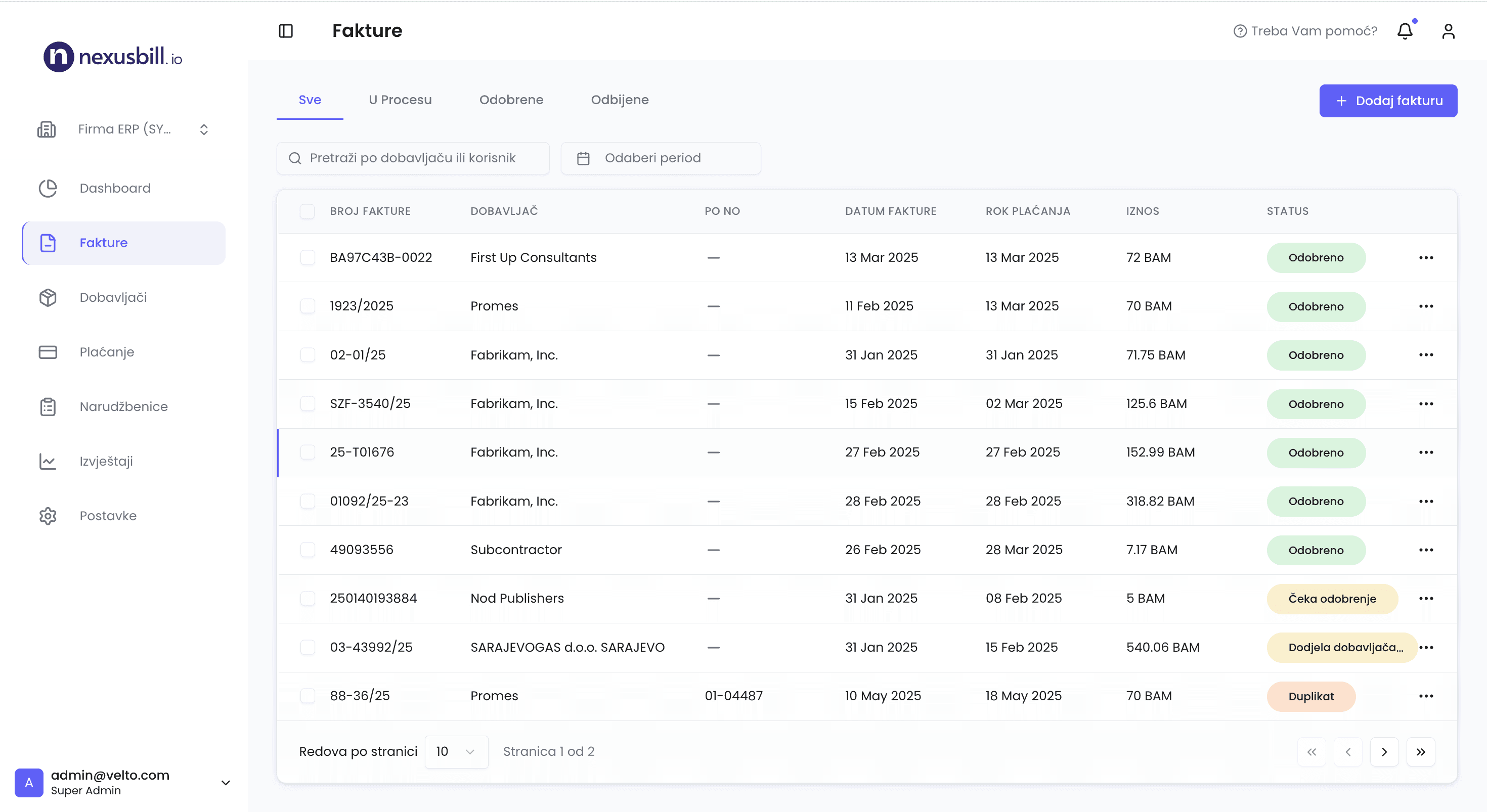 Fakture – pregled svih faktura, upload, statusi, detalji i praćenje kompletnog procesa obrade. Ovde se desava magija nexusbilla ai ekstrakcija, ai knjizenje…