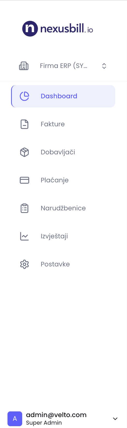 Navigacija u NexusBillu je organizovana tako da korisnik bez napora može pronaći sve funkcije sistema. Glavni elementi su jasno raspoređeni i dostupni odmah po ulasku u aplikaciju, a kompletan interfejs je prilagođen svakodnevnom radu korisnika koji obrađuju fakture, prate procese i upravljaju finansijskim dokumentima.