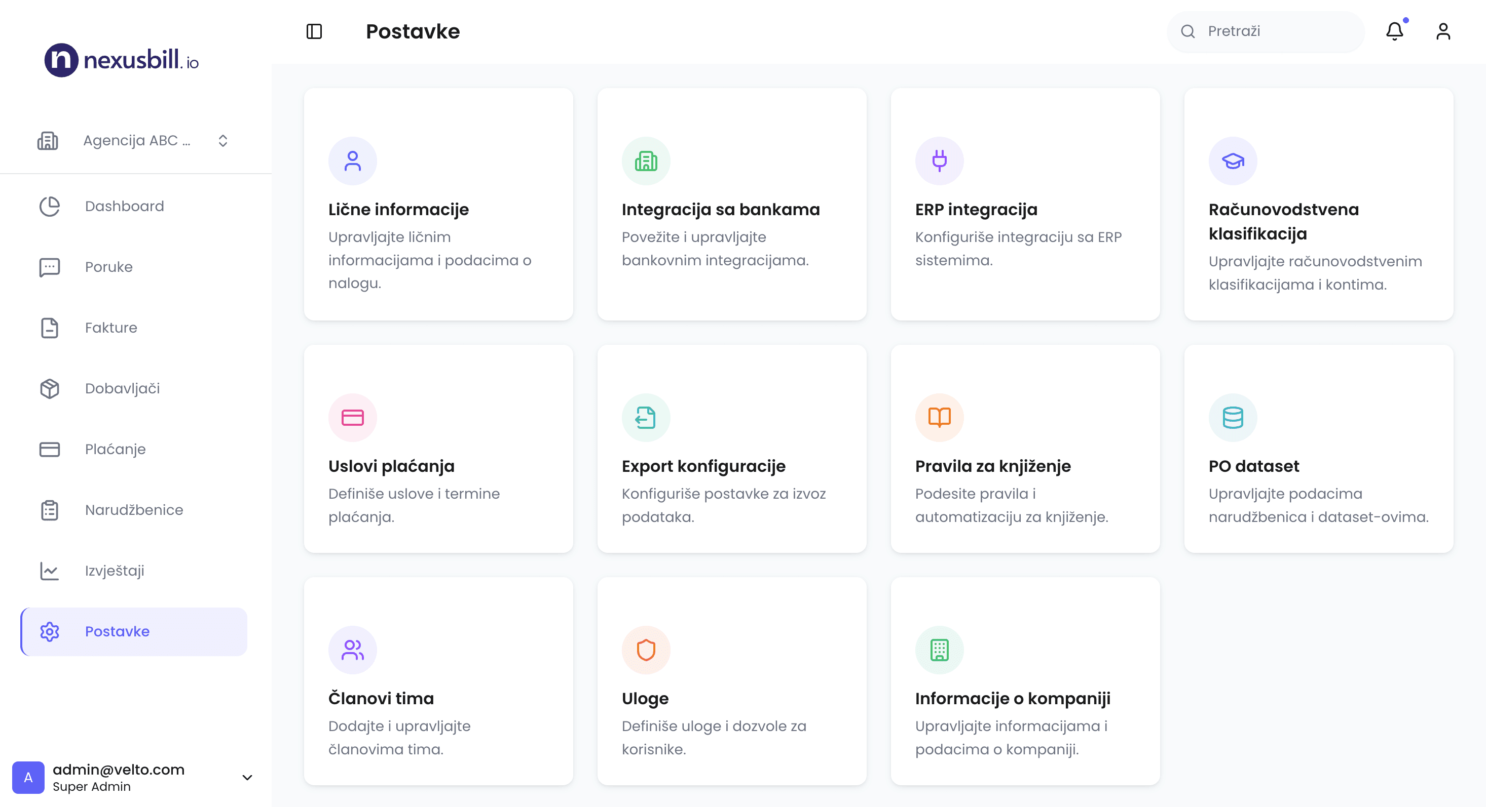 Postavke u NexusBillu predstavljaju centralno mjesto gdje korisnik upravlja svim ključnim elementima svog naloga, integracija i poslovnih pravila. Ovdje se podešavaju lični podaci, bankovni računi, ERP integracije, računovodstvena klasifikacija, pravila knjiženja i kompletna organizacija tima. Sve je grupisano tako da korisnik lako pronađe ono što mu treba i prilagodi sistem načinu rada svoje firme.